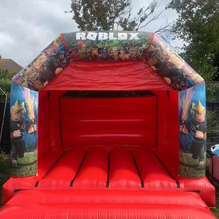 Perfect for little gamers, this castle features a red bouncy castle with a Roblox theme on the front.